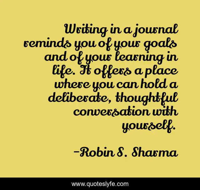 This page presents the quote "Writing in a journal reminds you of your goals and of your learning in life. It offers a place where you can hold a deliberate, thoughtful conversation with yourself.". Author of this quote is Robin S. Sharma. This quote is about life, goals, writing,.