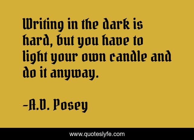 This page presents the quote "Writing in the dark is hard, but you have to light your own candle and do it anyway.". Author of this quote is A.D. Posey. This quote is about heart, storytelling, storytellers, soul, writing, write, writers, ad-posey, reader,.