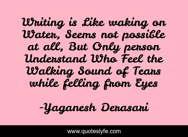 This page presents the quote "Writing is Like waking on Water, Seems not possible at all, But Only person Understand Who Feel the Walking Sound of Tears while felling from Eyes". Author of this quote is Yaganesh Derasari. This quote is about broken-hearted-men, tears, writing,.