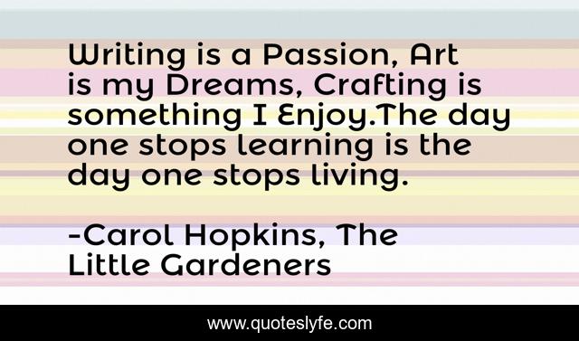 This page presents the quote "Writing is a Passion, Art is my Dreams, Crafting is something I Enjoy.The day one stops learning is the day one stops living.". Author of this quote is Carol Hopkins, The Little Gardeners. This quote is about childrens-books, gardening, artist,.