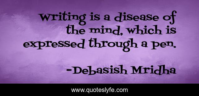 This page presents the quote "Writing is a disease of the mind, which is expressed through a pen.". Author of this quote is Debasish Mridha. This quote is about life, debasish, mridha, express, mind, disease, writing, pen, philosophy,.