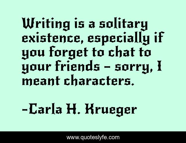 This page presents the quote "Writing is a solitary existence, especially if you forget to chat to your friends – sorry, I meant characters.". Author of this quote is Carla H. Krueger. This quote is about madness, psychology, writing, sanity, amaya-ellman, comedy,.