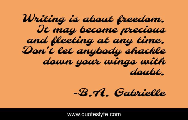 This page presents the quote "Writing is about freedom. It may become precious and fleeting at any time. Don't let anybody shackle down your wings with doubt.". Author of this quote is B.A. Gabrielle. .