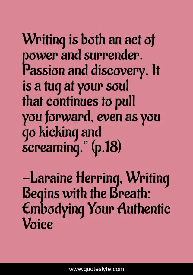 This page presents the quote "Writing is both an act of power and surrender. Passion and discovery. It is a tug at your soul that continues to pull you forward, even as you go kicking and screaming.” (p.18)". Author of this quote is Laraine Herring, Writing Begins with the Breath: Embodying Your Authentic Voice. This quote is about power, act-of-power, kicking-and-screaming, writing, passion, surrender, tug-at-your-soul, discovery,.