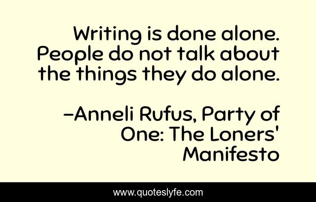 This page presents the quote "Writing is done alone. People do not talk about the things they do alone.". Author of this quote is Anneli Rufus, Party of One: The Loners' Manifesto. .