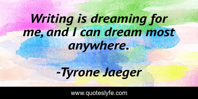 This page presents the quote "Writing is dreaming for me, and I can dream most anywhere.". Author of this quote is Tyrone Jaeger. This quote is about dreaming, writing,.