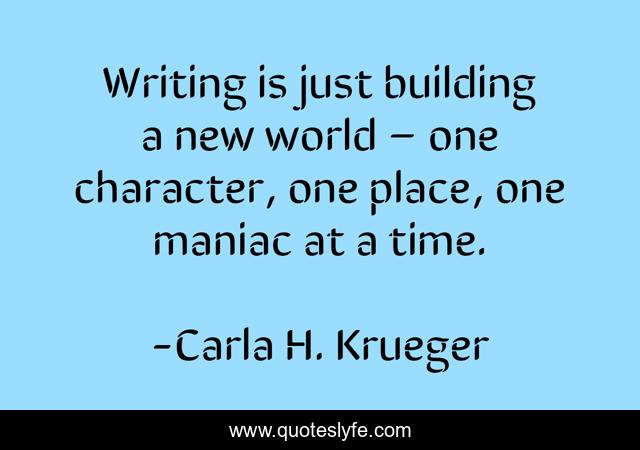 This page presents the quote "Writing is just building a new world – one character, one place, one maniac at a time.". Author of this quote is Carla H. Krueger. This quote is about build-new-world, fiction, new-character, writing,.