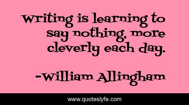 This page presents the quote "Writing is learning to say nothing, more cleverly each day.". Author of this quote is William Allingham. This quote is about day, learning, writing,.