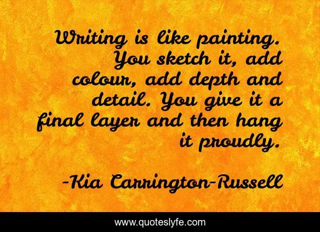 This page presents the quote "Writing is like painting. You sketch it, add colour, add depth and detail. You give it a final layer and then hang it proudly.". Author of this quote is Kia Carrington-Russell. This quote is about sketch, art, author, colour, proud, detail, creative, depth, writing,.