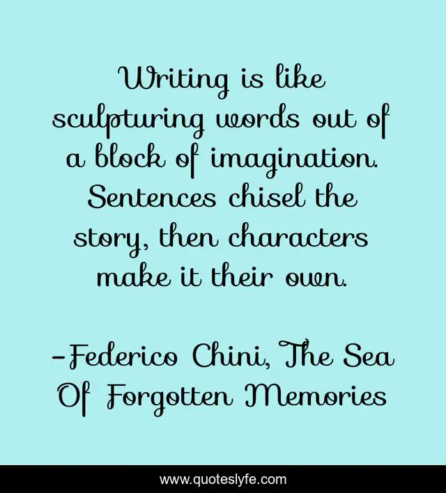 This page presents the quote "Writing is like sculpturing words out of a block of imagination. Sentences chisel the story, then characters make it their own.". Author of this quote is Federico Chini, The Sea Of Forgotten Memories. This quote is about imagination, sculpturing, inspiration, writing,.