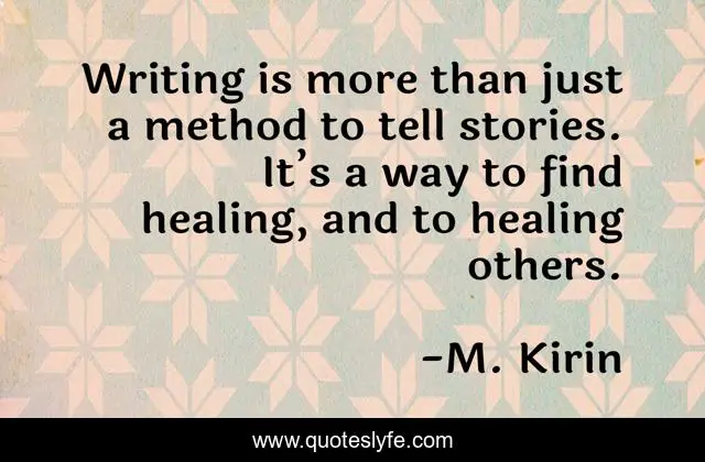 This page presents the quote "Writing is more than just a method to tell stories. It’s a way to find healing, and to healing others.". Author of this quote is M. Kirin. This quote is about writer-inspiration, writing-advice, writer, writing, healing, inspiration,.