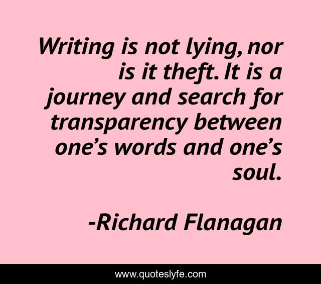 This page presents the quote "Writing is not lying, nor is it theft. It is a journey and search for transparency between one’s words and one’s soul.". Author of this quote is Richard Flanagan. This quote is about soul, writing,.