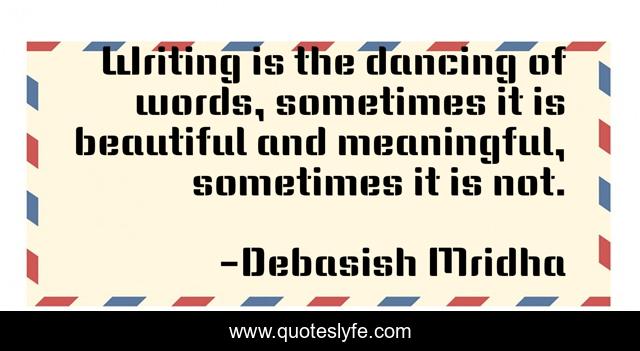 This page presents the quote "Writing is the dancing of words, sometimes it is beautiful and meaningful, sometimes it is not.". Author of this quote is Debasish Mridha. This quote is about beautiful, life, debasish, dancing, mridha, philosophy, writing, words, meaningful,.