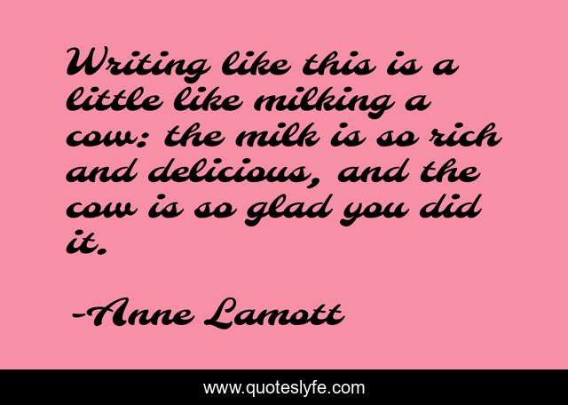 This page presents the quote "Writing like this is a little like milking a cow: the milk is so rich and delicious, and the cow is so glad you did it.". Author of this quote is Anne Lamott. This quote is about writers, life-lessons, writing-process,.