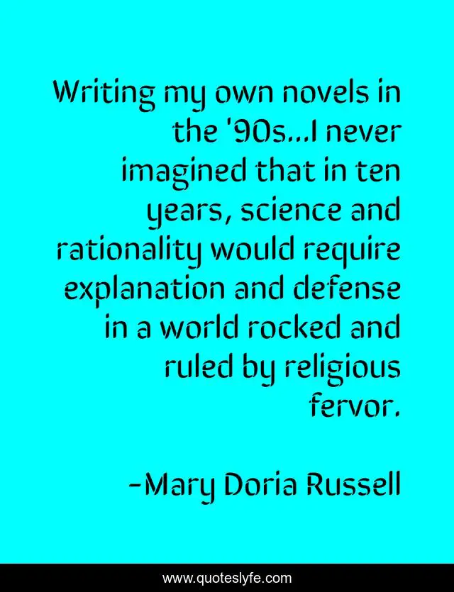 This page presents the quote "Writing my own novels in the '90s...I never imagined that in ten years, science and rationality would require explanation and defense in a world rocked and ruled by religious fervor.". Author of this quote is Mary Doria Russell. This quote is about religion, rationality, science,.
