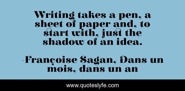 This page presents the quote "Writing takes a pen, a sheet of paper and, to start with, just the shadow of an idea.". Author of this quote is Françoise Sagan, Dans un mois, dans un an. This quote is about writing-process, writing,.