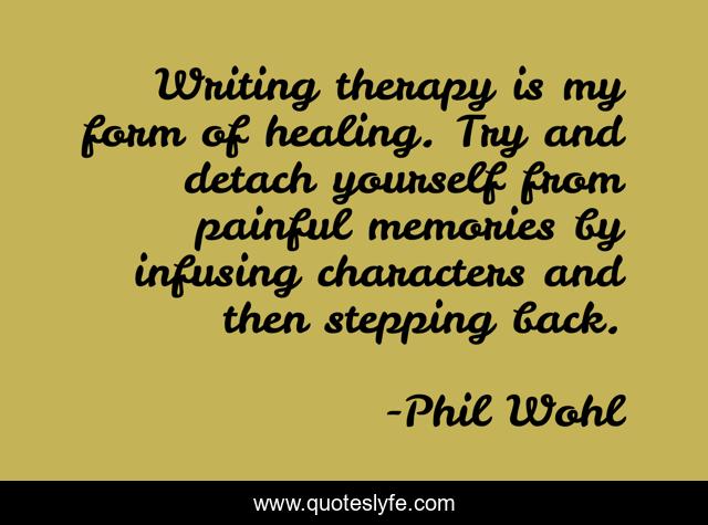 This page presents the quote "Writing therapy is my form of healing. Try and detach yourself from painful memories by infusing characters and then stepping back.". Author of this quote is Phil Wohl. This quote is about abuse-recovery, healing,.