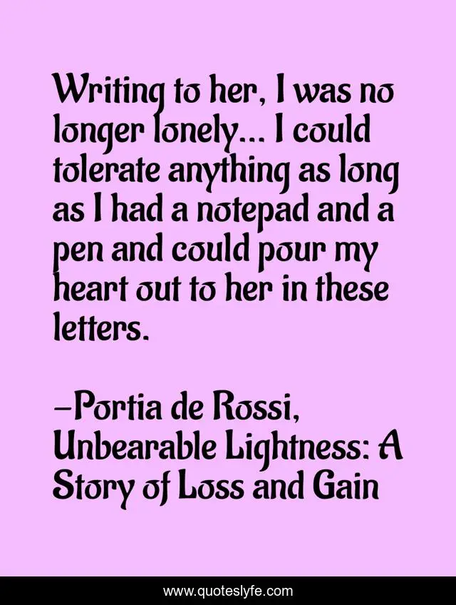 This page presents the quote "Writing to her, I was no longer lonely... I could tolerate anything as long as I had a notepad and a pen and could pour my heart out to her in these letters.". Author of this quote is Portia de Rossi, Unbearable Lightness: A Story of Loss and Gain. This quote is about letters, lovers, love, affection, writing,.