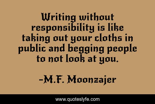 This page presents the quote "Writing without responsibility is like taking out your cloths in public and begging people to not look at you.". Author of this quote is M.F. Moonzajer. This quote is about responsibility, honor,.