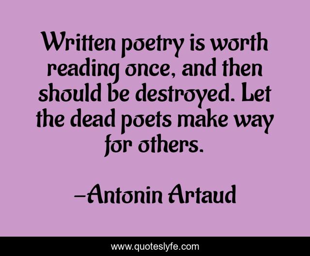 This page presents the quote "Written poetry is worth reading once, and then should be destroyed. Let the dead poets make way for others.". Author of this quote is Antonin Artaud. This quote is about reading, way, dead,.