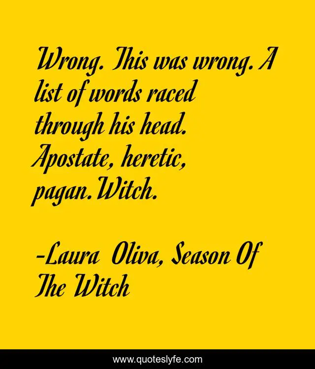 This page presents the quote "Wrong. This was wrong. A list of words raced through his head. Apostate, heretic, pagan.Witch.". Author of this quote is Laura Oliva, Season Of The Witch. This quote is about urban-fantasy-romance, witches, forbidden-pleasure,.