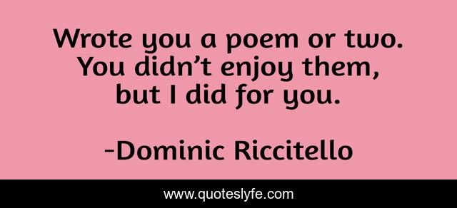 This page presents the quote "Wrote you a poem or two. You didn’t enjoy them, but I did for you.". Author of this quote is Dominic Riccitello. This quote is about enjoy, poem, love, regret, quote, poetry, sad, happiness, affection,.