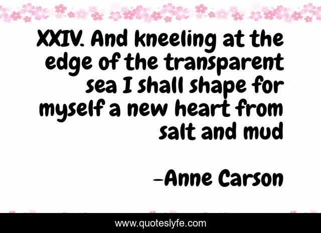 This page presents the quote "XXIV. And kneeling at the edge of the transparent sea I shall shape for myself a new heart from salt and mud". Author of this quote is Anne Carson. This quote is about heart, life, love, heartbreak, inspirational, enthusiasm, affection,.