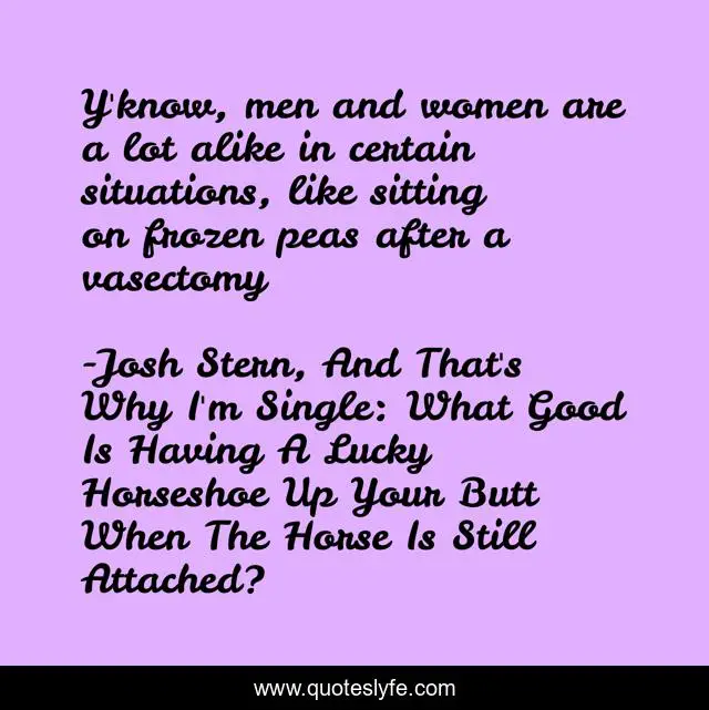 This page presents the quote "Y'know, men and women are a lot alike in certain situations, like sitting on frozen peas after a vasectomy". Author of this quote is Josh Stern, And That's Why I'm Single: What Good Is Having A Lucky Horseshoe Up Your Butt When The Horse Is Still Attached?. This quote is about vasectomy, humor, frozen, men, peas, alike, women,.