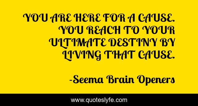This page presents the quote "YOU ARE HERE FOR A CAUSE. YOU REACH TO YOUR ULTIMATE DESTINY BY LIVING THAT CAUSE.". Author of this quote is Seema Brain Openers. This quote is about life, leadership, motivation, success,.
