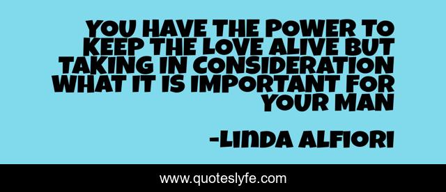 This page presents the quote "YOU HAVE THE POWER TO KEEP THE LOVE ALIVE BUT TAKING IN CONSIDERATION WHAT IT IS IMPORTANT FOR YOUR MAN". Author of this quote is Linda Alfiori. This quote is about love, dating-soul-mate, marriage, affection, long-lasting-love,.