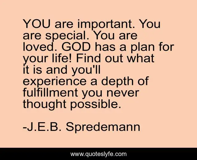 This page presents the quote "YOU are important. You are special. You are loved. GOD has a plan for your life! Find out what it is and you'll experience a depth of fulfillment you never thought possible.". Author of this quote is J.E.B. Spredemann. This quote is about me, individuality, people, god-s-plan, creation, self-worth, importance, fulfillment, significance,.