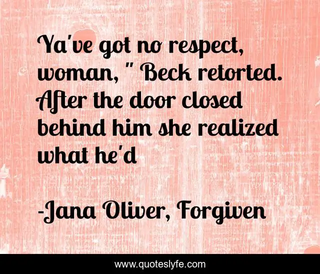 This page presents the quote "Ya've got no respect, woman, " Beck retorted. After the door closed behind him she realized what he'd". Author of this quote is Jana Oliver, Forgiven. This quote is about riley-blackthorne, woman, denver-beck,.