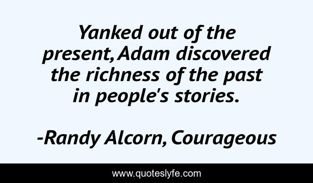 This page presents the quote "Yanked out of the present, Adam discovered the richness of the past in people's stories.". Author of this quote is Randy Alcorn, Courageous. This quote is about conversation, listening, presentism, discipleship, urgency, history,.
