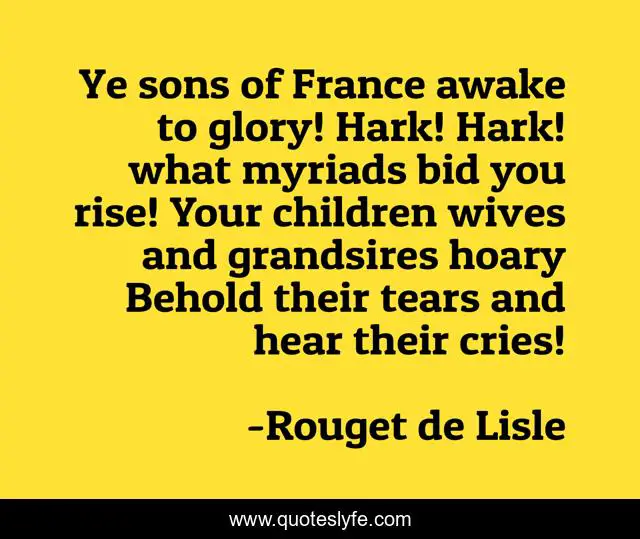"Rouget de Lisle Quotes." Quoteslyfe.com, 2025. Sat. 06 Dec. 2025. <https://www.quoteslyfe.com/quote/Ye-sons-of-France-awake-to-glory-265575>.