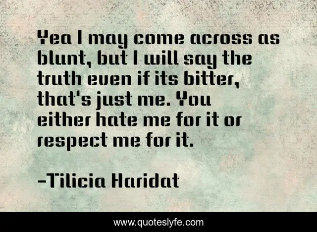 This page presents the quote "Yea I may come across as blunt, but I will say the truth even if its bitter, that's just me. You either hate me for it or respect me for it.". Author of this quote is Tilicia Haridat. This quote is about self-motivation, respect, life-and-living, truth-inspirational,.