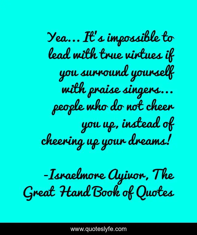 This page presents the quote "Yea... It's impossible to lead with true virtues if you surround yourself with praise singers... people who do not cheer you up, instead of cheering up your dreams!". Author of this quote is Israelmore Ayivor, The Great Hand Book of Quotes. This quote is about praise-singers, people, lies, deceivers, impossible, food-for-thought, deception, lead, cheer,.