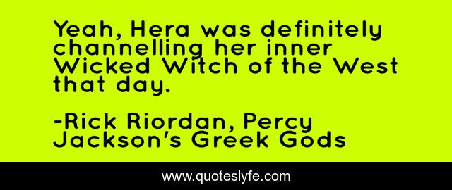 This page presents the quote "Yeah, Hera was definitely channelling her inner Wicked Witch of the West that day.". Author of this quote is Rick Riordan, Percy Jackson's Greek Gods. This quote is about funny, percy-jackson, greek-gods, oz, witches, comedy,.
