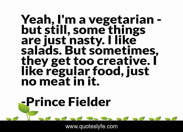 This page presents the quote "Yeah, I'm a vegetarian - but still, some things are just nasty. I like salads. But sometimes, they get too creative. I like regular food, just no meat in it.". Author of this quote is Prince Fielder. This quote is about sometimes, meat, creative,.