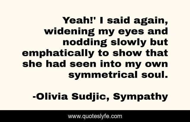 This page presents the quote "Yeah!' I said again, widening my eyes and nodding slowly but emphatically to show that she had seen into my own symmetrical soul.". Author of this quote is Olivia Sudjic, Sympathy. This quote is about olivia-sudjic, soulmates, sympathy,.