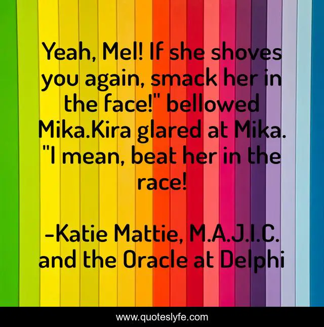 This page presents the quote "Yeah, Mel! If she shoves you again, smack her in the face!" bellowed Mika.Kira glared at Mika. "I mean, beat her in the race!". Author of this quote is Katie Mattie, M.A.J.I.C. and the Oracle at Delphi. This quote is about humor-inspirational, race,.