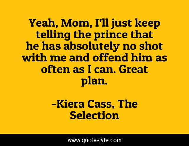 This page presents the quote "Yeah, Mom, I’ll just keep telling the prince that he has absolutely no shot with me and offend him as often as I can. Great plan.". Author of this quote is Kiera Cass, The Selection. This quote is about america, mom,.