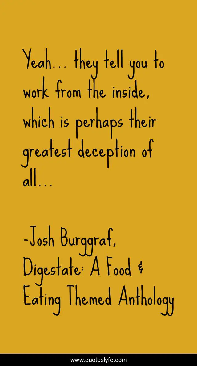 "Josh Burggraf, Digestate: A Food & Eating Themed Anthology Quotes." Quoteslyfe.com, 2025. Fri. 05 Dec. 2025. <https://www.quoteslyfe.com/quote/Yeah-they-tell-you-to-work-from-167404>.