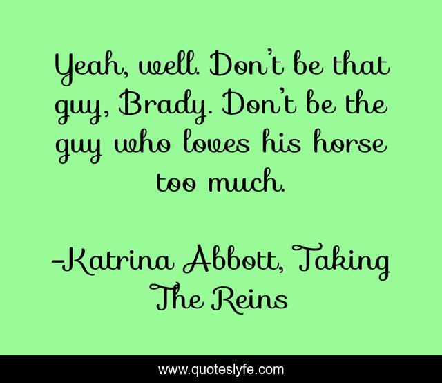 This page presents the quote "Yeah, well. Don’t be that guy, Brady. Don’t be the guy who loves his horse too much.". Author of this quote is Katrina Abbott, Taking The Reins. This quote is about horses, love, flirting, romance, young-adult, affection,.