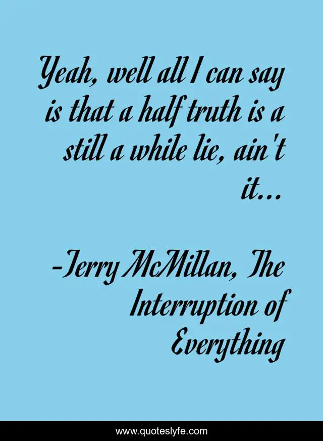 This page presents the quote "Yeah, well all I can say is that a half truth is a still a while lie, ain't it...". Author of this quote is Terry McMillan, The Interruption of Everything. This quote is about lies, truth,.