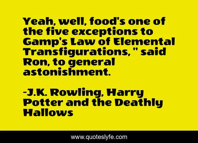 This page presents the quote "Yeah, well, food's one of the five exceptions to Gamp's Law of Elemental Transfigurations, " said Ron, to general astonishment.". Author of this quote is J.K. Rowling, Harry Potter and the Deathly Hallows. This quote is about ron-weasley, humor,.