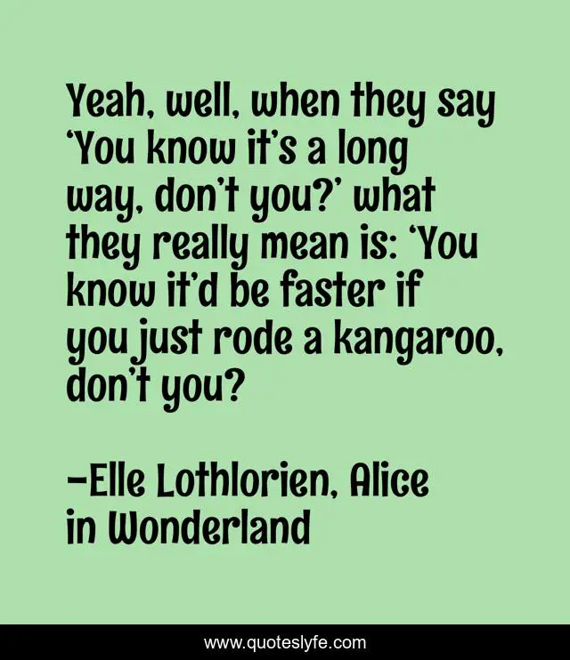 This page presents the quote "Yeah, well, when they say ‘You know it’s a long way, don’t you?’ what they really mean is: ‘You know it’d be faster if you just rode a kangaroo, don’t you?". Author of this quote is Elle Lothlorien, Alice in Wonderland. .