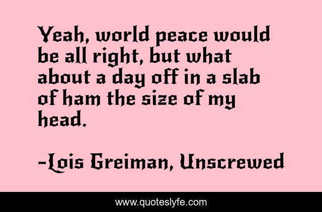 This page presents the quote "Yeah, world peace would be all right, but what about a day off in a slab of ham the size of my head.". Author of this quote is Lois Greiman, Unscrewed. This quote is about mystery, chick-lit, humor,.