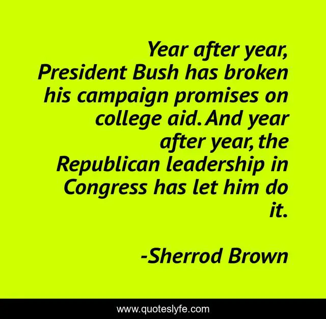 This page presents the quote "Year after year, President Bush has broken his campaign promises on college aid. And year after year, the Republican leadership in Congress has let him do it.". Author of this quote is Sherrod Brown. This quote is about broken, college, president,.