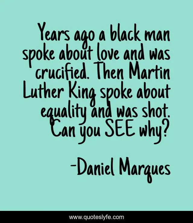 This page presents the quote "Years ago a black man spoke about love and was crucified. Then Martin Luther King spoke about equality and was shot. Can you SEE why?". Author of this quote is Daniel Marques. This quote is about love, affection, christianity,.