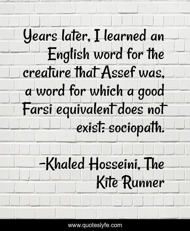 This page presents the quote "Years later, I learned an English word for the creature that Assef was, a word for which a good Farsi equivalent does not exist: sociopath.". Author of this quote is Khaled Hosseini, The Kite Runner. This quote is about psychopathy, evil, sociopathy,.